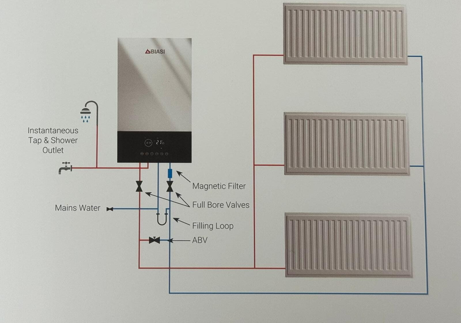 {Instantaneous Tap & Shower Outlet}—{Mains Water}—{Magnetic Filter}—{Full Bore Valves}—{Filling Loop}—{ABV}